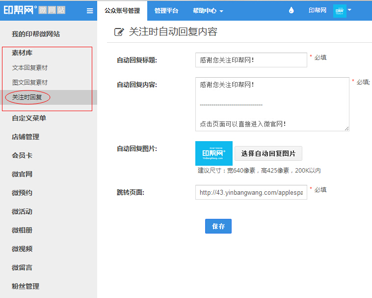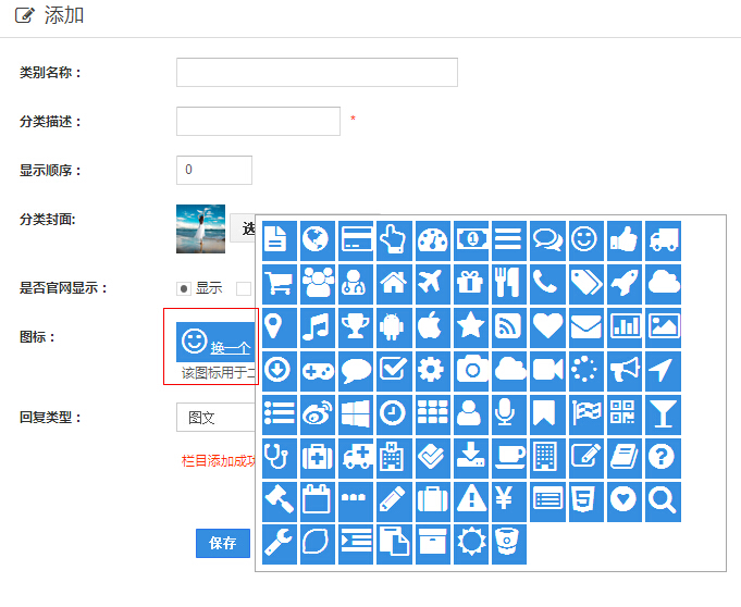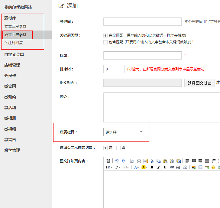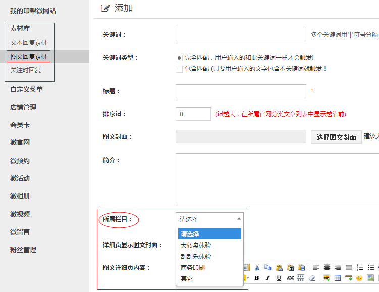 图文回复素材:这个模块就是对应栏目导航下面添加内容,在添加内容的时候有一个(所属栏目)这里就根据需要选择:栏目导航对应的菜单如果是图文就选择,如果是链接的话就不选择。需要注意特别说明一点:链接类型的图文回复需要现在【图文回复素材】里面添加好内容,然后再到栏目导航里面去添加其菜单,选择链接类型。