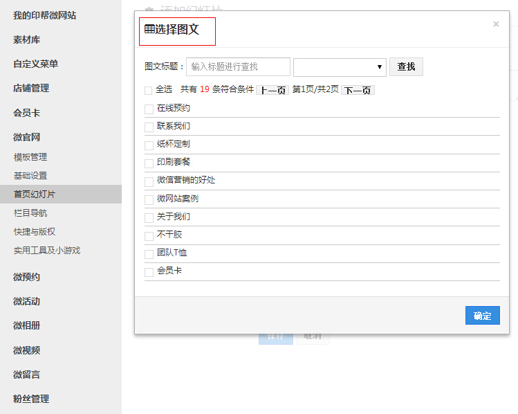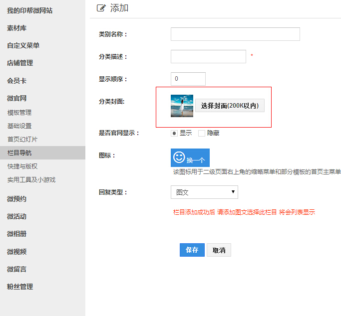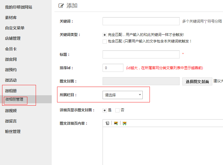 添加一张封面图片,需要选择所属栏目。微留言管理:这里可以看到用户的留言信息,不过所有的留言都必须经过审核之后其他的粉丝才能看见。