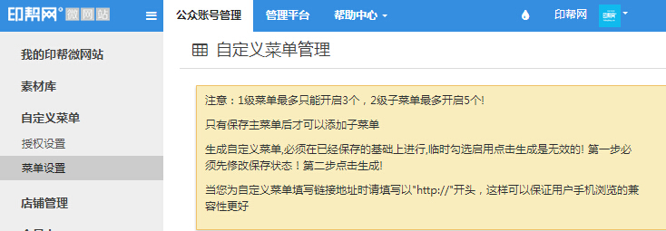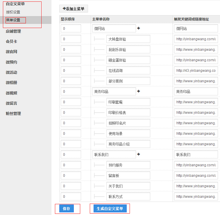 菜单设置:服务号和认证的订阅号才有自定义菜单。自定义菜单的添加:主菜单名称必须对应相应的网址链接。先点击“保存”按钮,然后再点击“生成自定义菜单”。