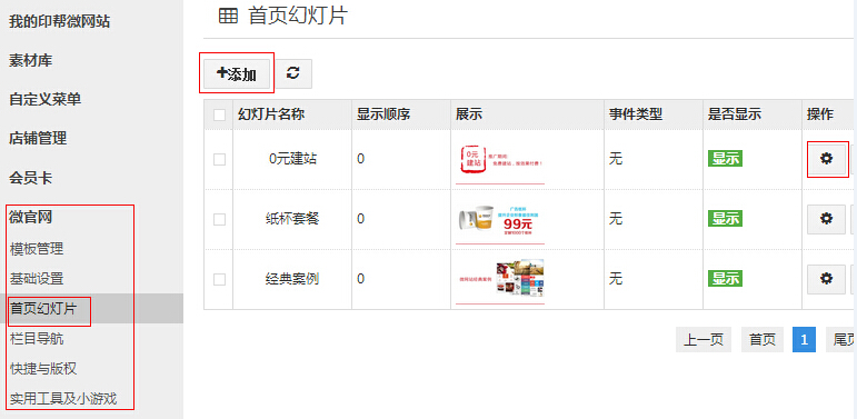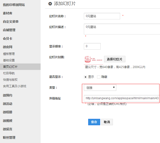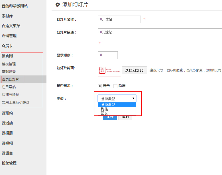 首页幻灯片:就是手机微网站顶部的轮播图片,这里的图片可以放一些自己店面的经典图片,不过幻灯片的尺寸最好是一样的,建议尺寸(640*425)。建议放4-6张幻灯片。