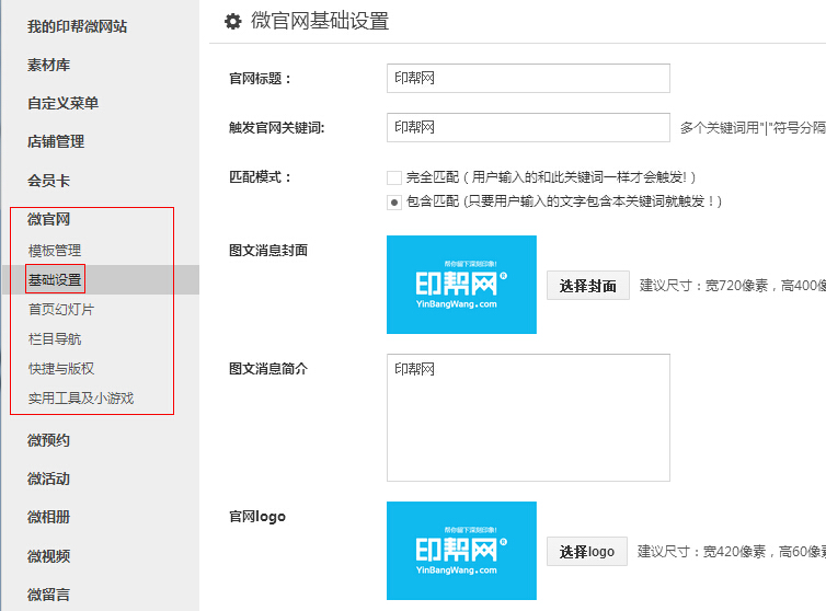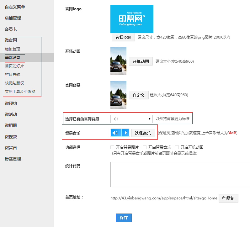 基础设置:填写自己官网的名字和logo,就可以实现在手机键盘上面输入任意字符回复到微网站,微网站就会给用户发消息。里面还可以设置背景音乐、背景图片等。