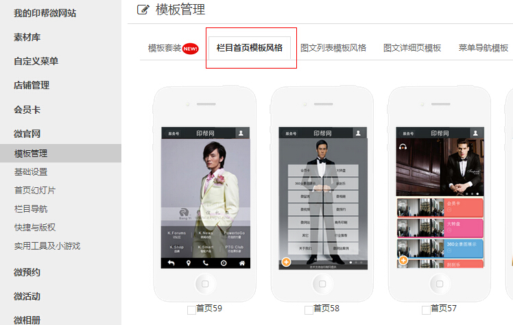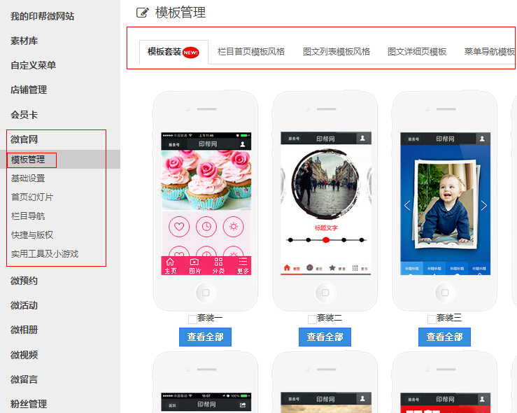 模板管理:就是微网站的皮肤管理,模板有分有套装模板和单个独立的模板,用户可以根据自己的需求选择不同的模板。更换模板只需点击您选中的模板即可。