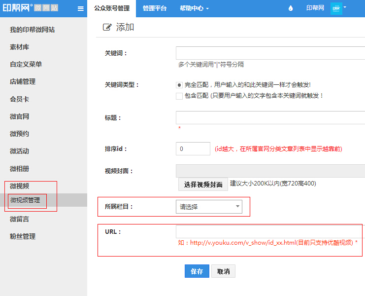所属栏目一定要选择,不然就找不到组织了。添加图片可以选择多张上传,不过每张图片的大小不能超过200K。微视频管理:和微相册同原理,都需要先建立栏目导航,然后选择所属栏目。这里就只需要一个优酷的视频链接(我们现在暂时只支持优酷的视频)
