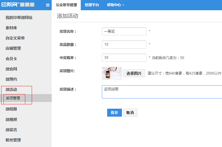 这里包含了奖项名称、中奖数量以及中奖概率的设置。还有对应的奖品的图片以及奖项说明。相册管理:因为这是一个单独的模块,所以需要现在栏目导航里面创建好微相册这个栏目,然后在添加相册的时候选择对应的相册栏目。